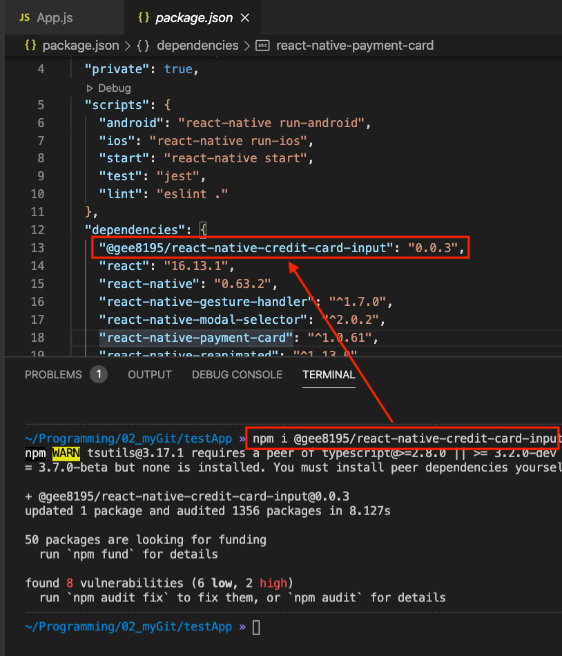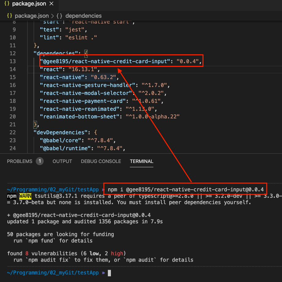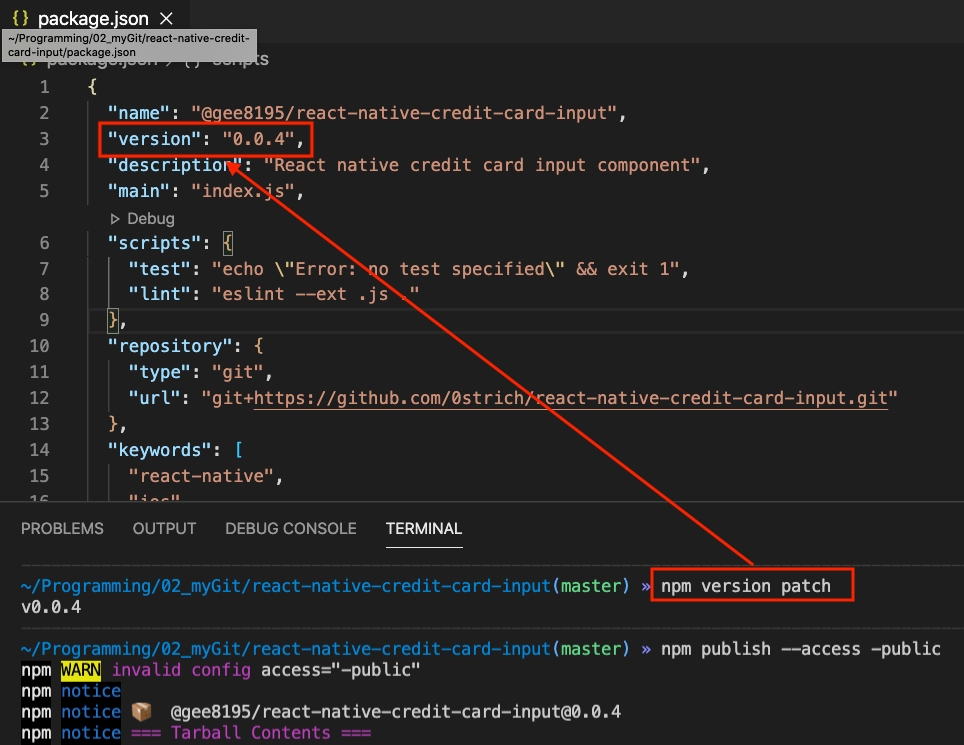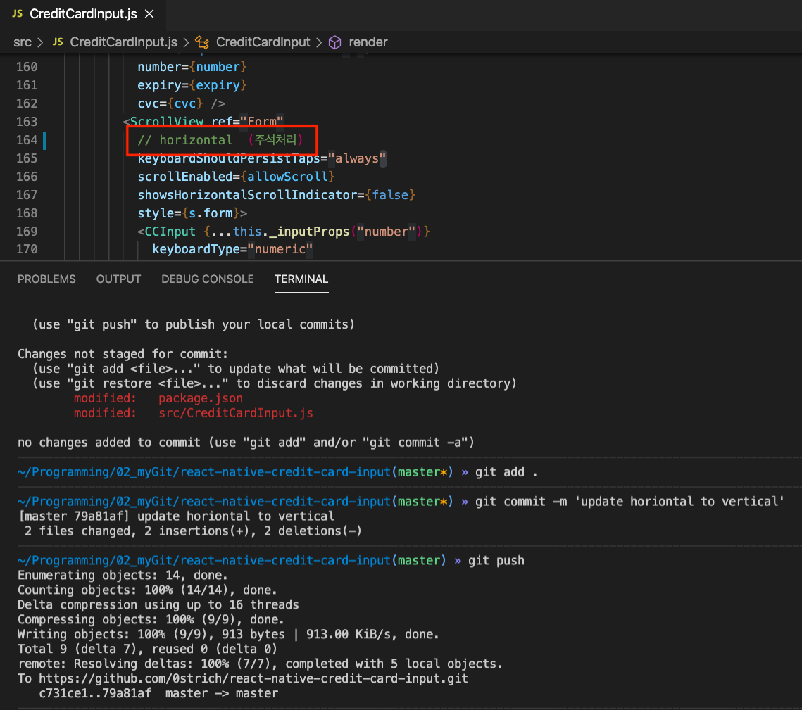 이제 fork 한 소스를 수정해서 카드정보를 입력하는 부분을 수직으로 바꾼 후, npm version patch를 해보자.