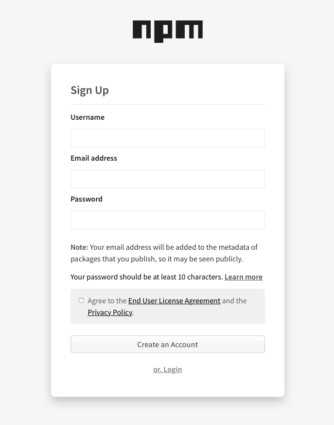 npm 배포를 하기 위해선 npmjs.com 사이트에서 회원가입을 해야 한다.