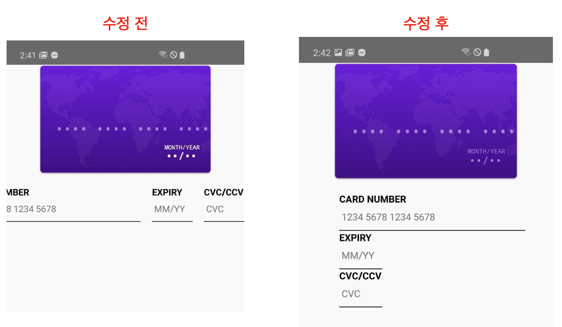 수평으로 고정되어 있는 카드 정보 입력창을 변경해서 사용하고 싶지만, 기존의 모듈에서 수직으로 설정하는 부분을 만들어 놓지 않았다.