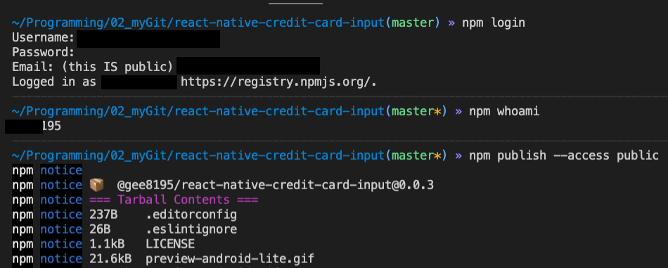 수정된 모듈 파일을 commit 후, npm login 명령어를 사용해서 터미널에서 npm 로그인을 한다.