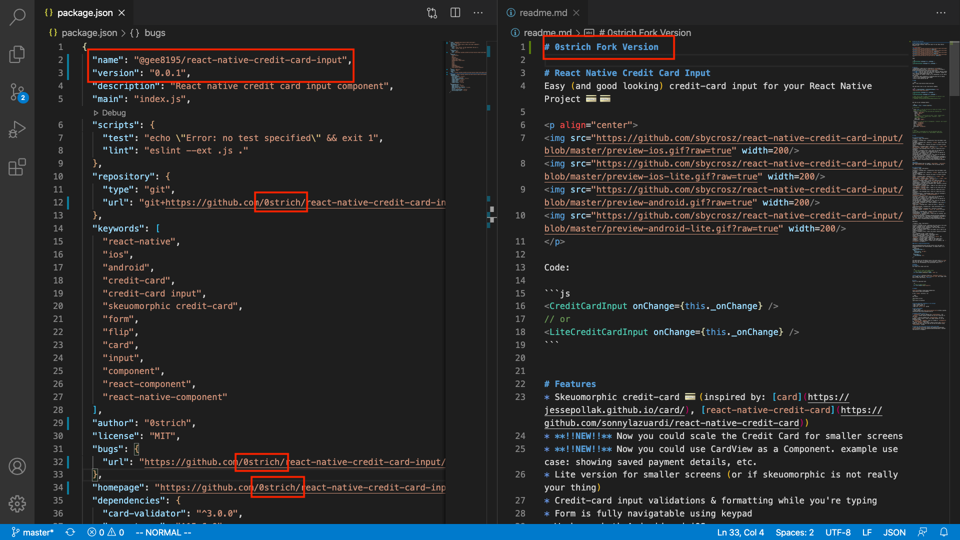 에디터로 해당 모듈을 열어서 package.json, README.md 파일을 본인 계정으로 수정한다.