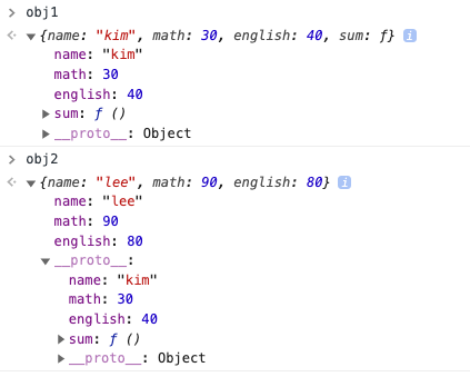 obj1 에는 성적을 합산하는 sum() 메서드가 존재한다. 해당 메서드를 obj2에서도 사용하기 위해서 obj2의 __proto__ 에 obj1를 대입해줌으로써 객체 간의 상속이 이루어졌다.